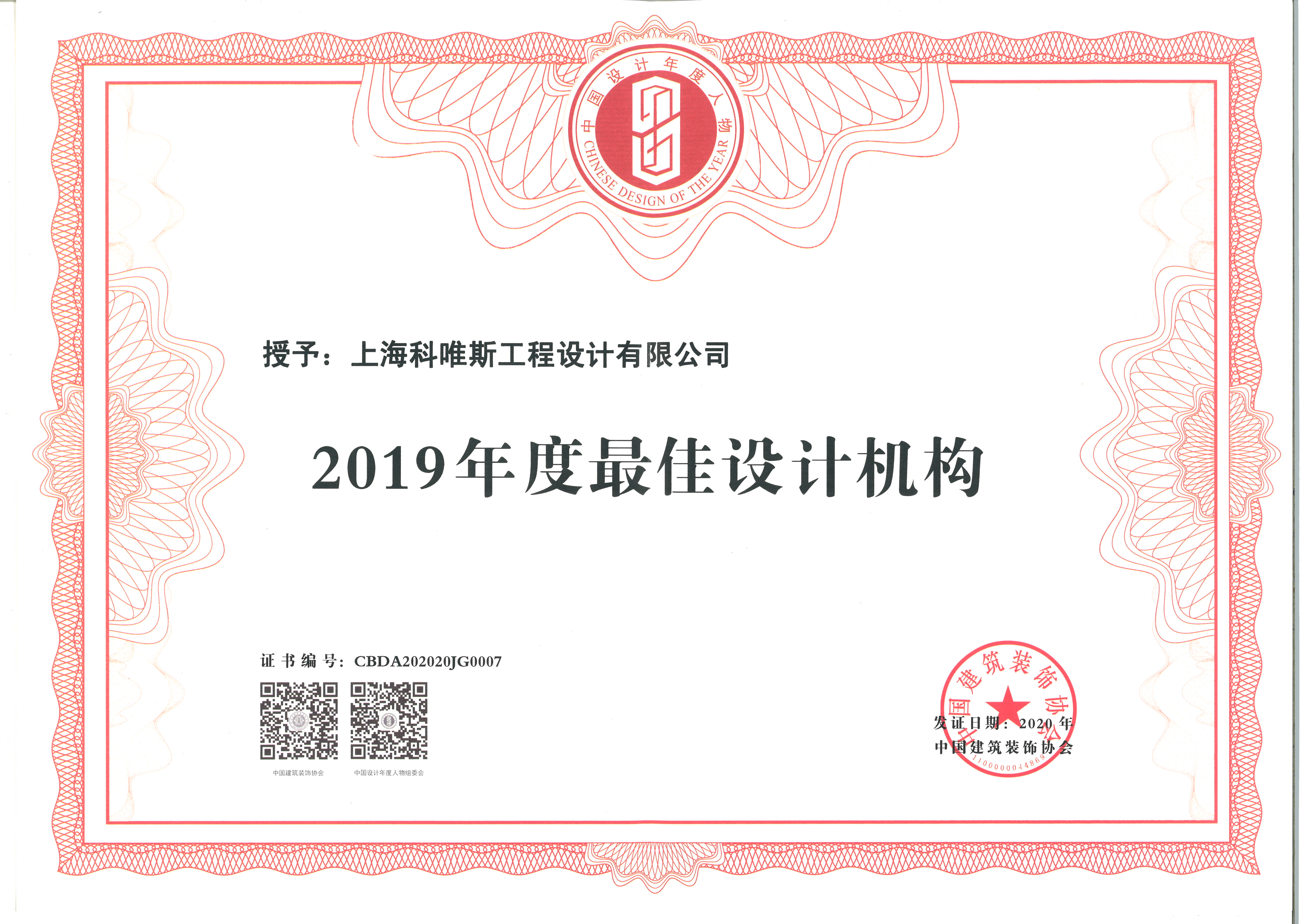 上海科唯斯工程設計有限公司在本次中國設計年度大會中,榮獲【2019年中國建筑裝飾行業年度最佳設計機構】。