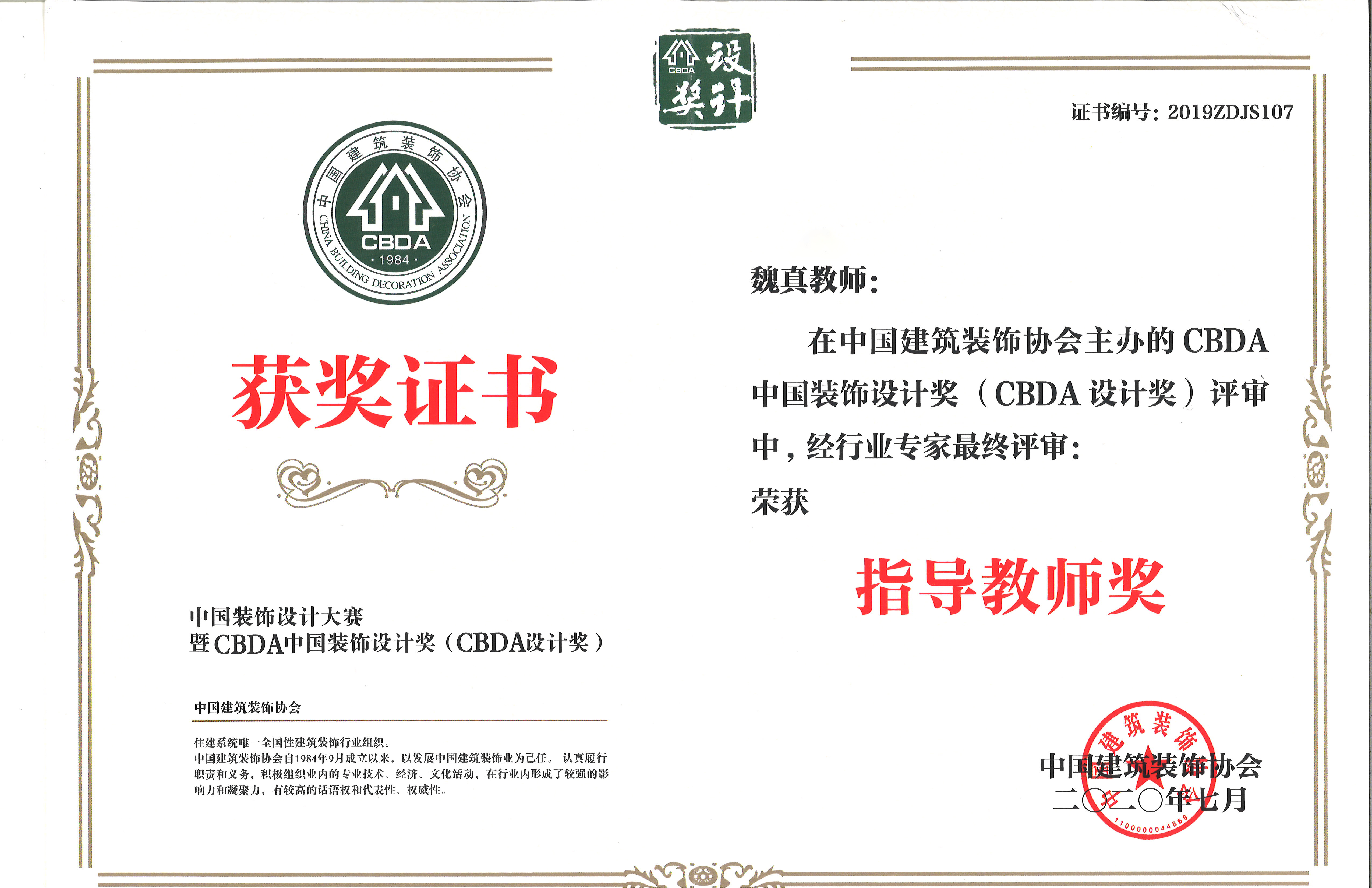 CBDA中國裝飾設計大賽為發現設計人才、展現設計師實力和才華搭建了良好平臺。中國建筑裝飾設計藝術展(簡稱CBDA設計展)展示了建筑裝飾設計行業科學研究和技術進步的成果。魏真教授在此次設計賽中榮獲了指導教師獎。