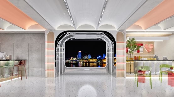 老外灘黨群服務中心融東西方建筑文化之美,室外設計沿自寧波老外灘石庫門建筑特點,提取石庫門拱形元素,并結合參數化設計,用裝飾型的設計線條呈現,風格現代簡約,表達出寧波老外灘黨群服務中心積極創建,服務青年人才,黨青結合,青春黨建的核心理念。