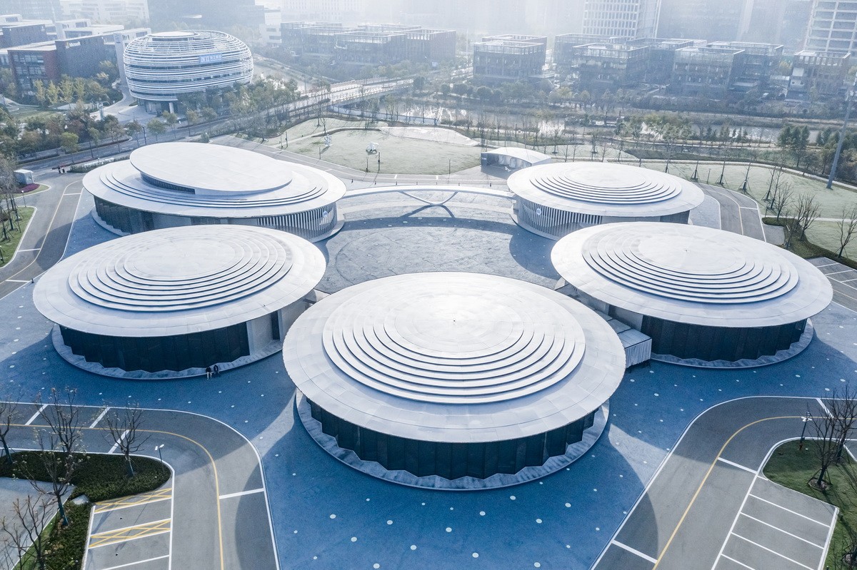 5個室內的場景,通過一個半室外的環廊觀展流線聯系在一起。室內場景作為主題展覽區,向心式布局圍合出中心廣場室外科技展場,各主題展館之間的建筑間隙為臨時展場,在環形流線上靈活的更換。形成環廊流線上的可模塊式串聯體驗。建筑群外圍為室外無人駕駛車展示場所。