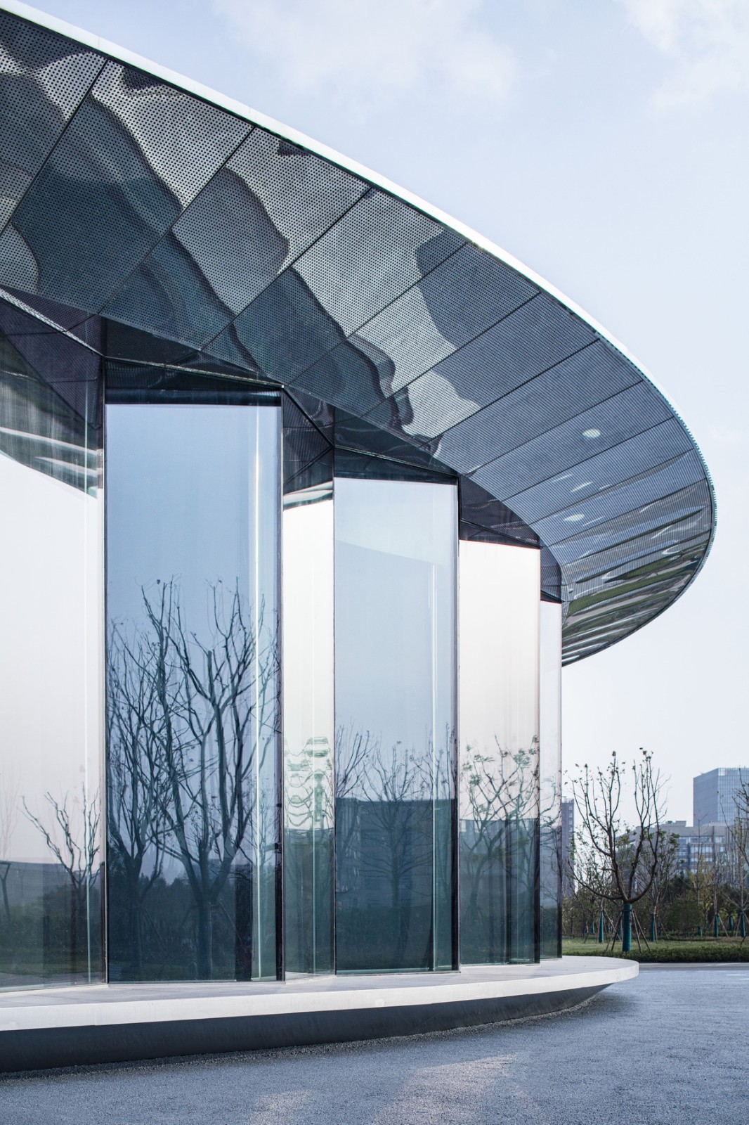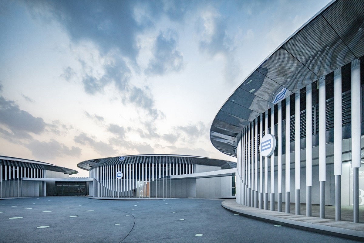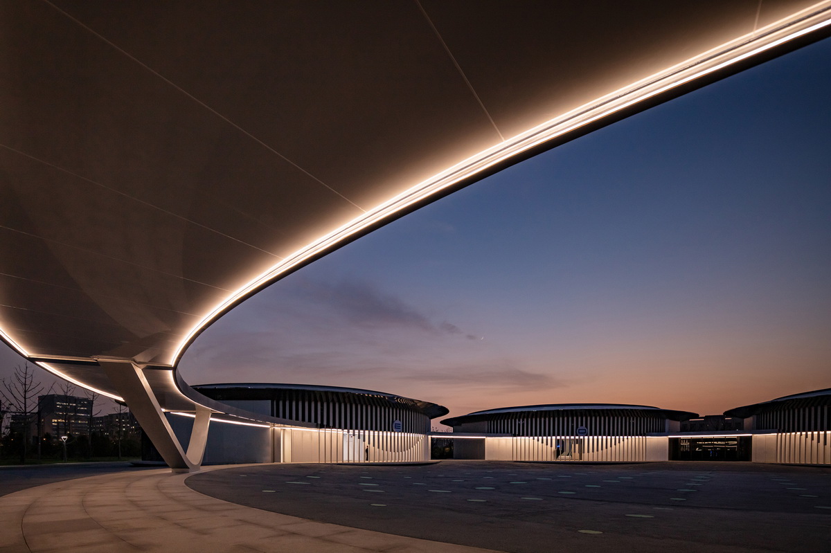 屋面以8mm厚鋼板整片焊接而成,隱藏接縫,頂部波紋狀處理方式增強屋面立體感;挑檐以大尺度穿孔不銹鋼板拼接而成,高反射性材質倒映出虛化的地面、周邊建筑與人,營造出強烈的未來感;外圍5.3米高隱框玻璃幕墻折線拼接,實現建筑與周邊環境的滲透融合;中心廣場僅采用漸變的熒光石點陣,模糊了近人的尺度。廊下吊頂膜材形成連續延展的光帶,形成特別的科技場景。